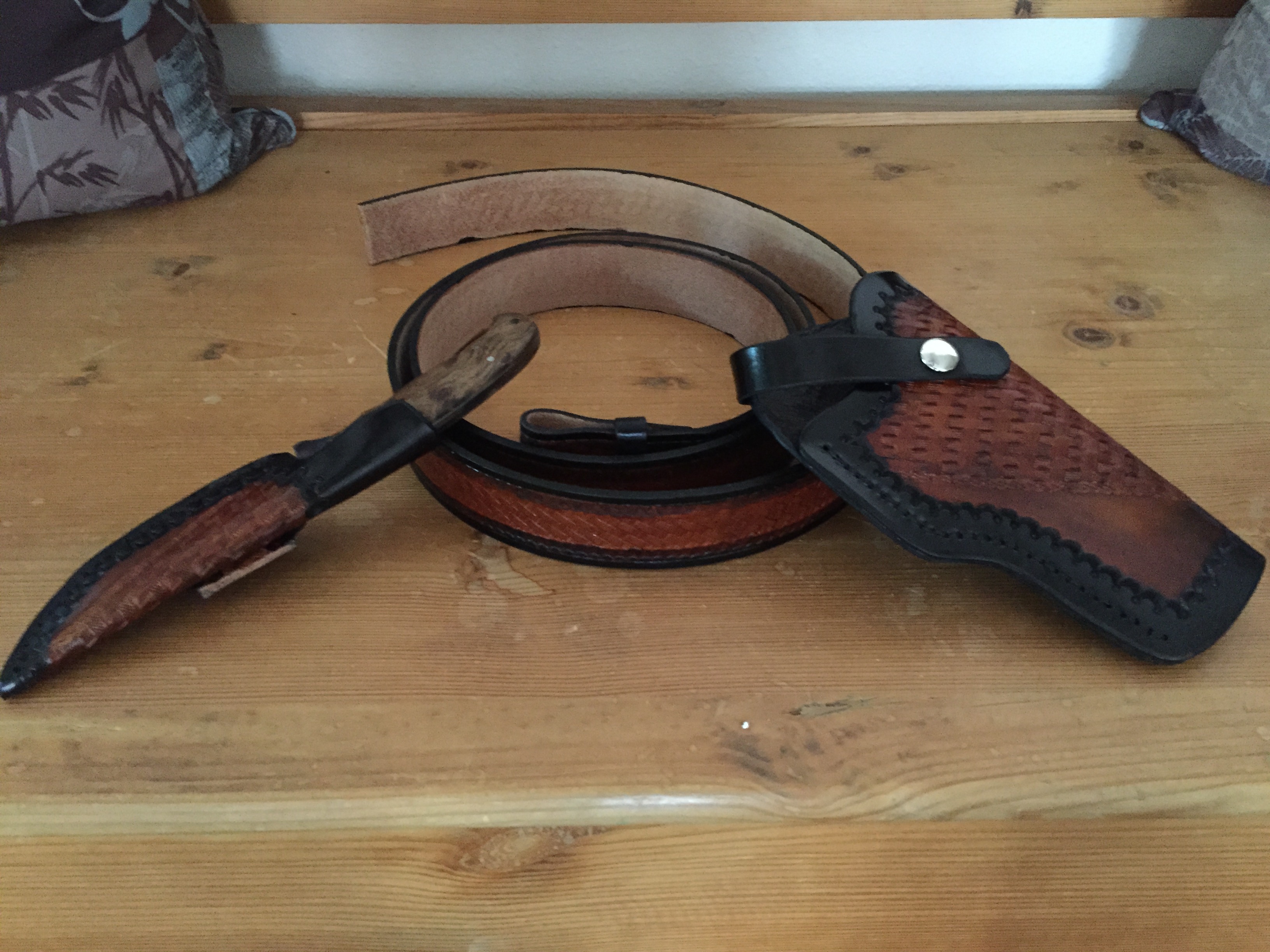 I needed a new belt, and most of the ones I found in the stores were either very expensive or did not work well as a carry belt. Most dress belts do not, because they are built for a different purpose. My standard belt is 1 3/4 wide. I build belts from pre-cut blanks. Some are tooled, though most are not. I dye them to match the holster and any accessories. |