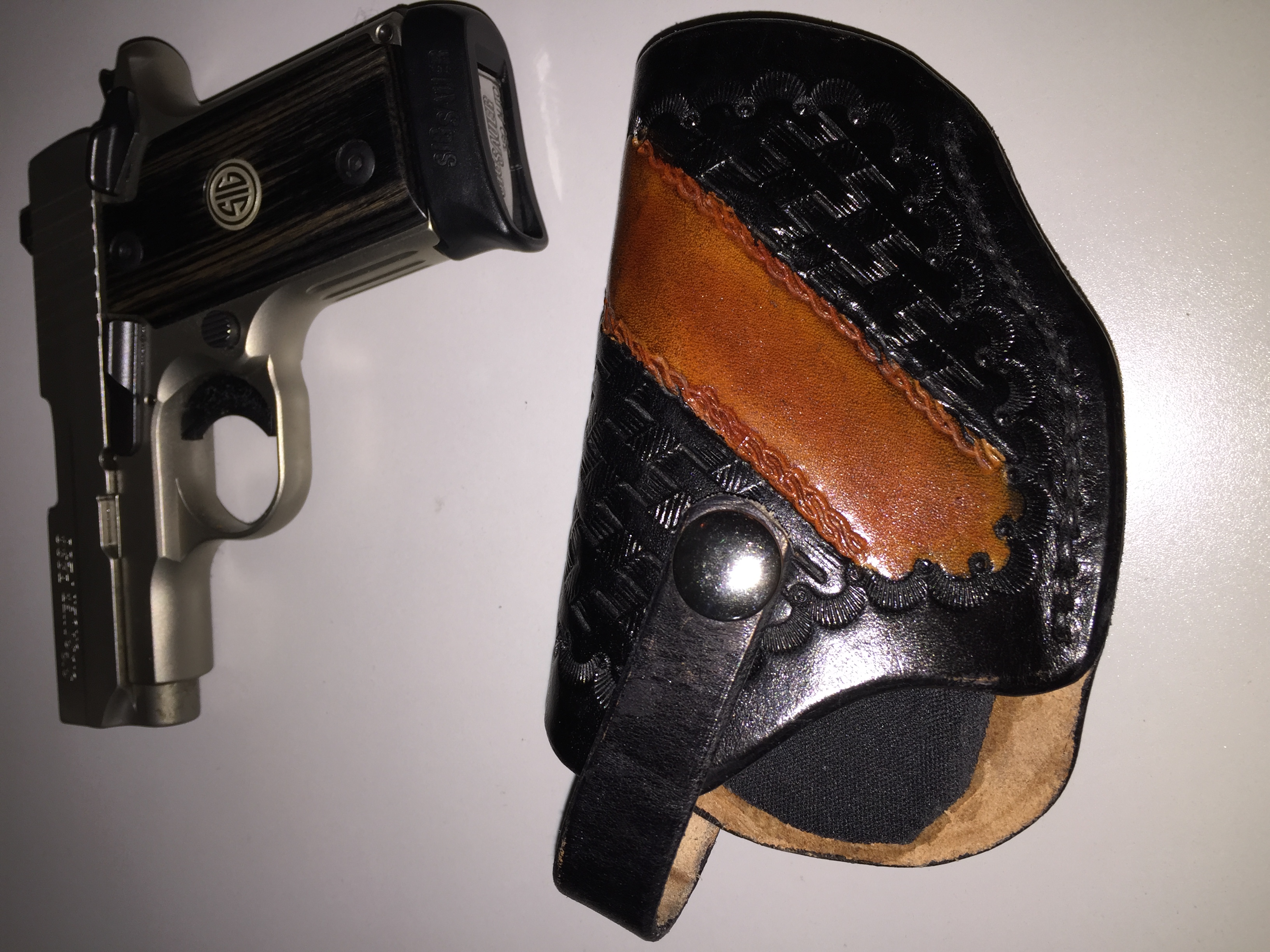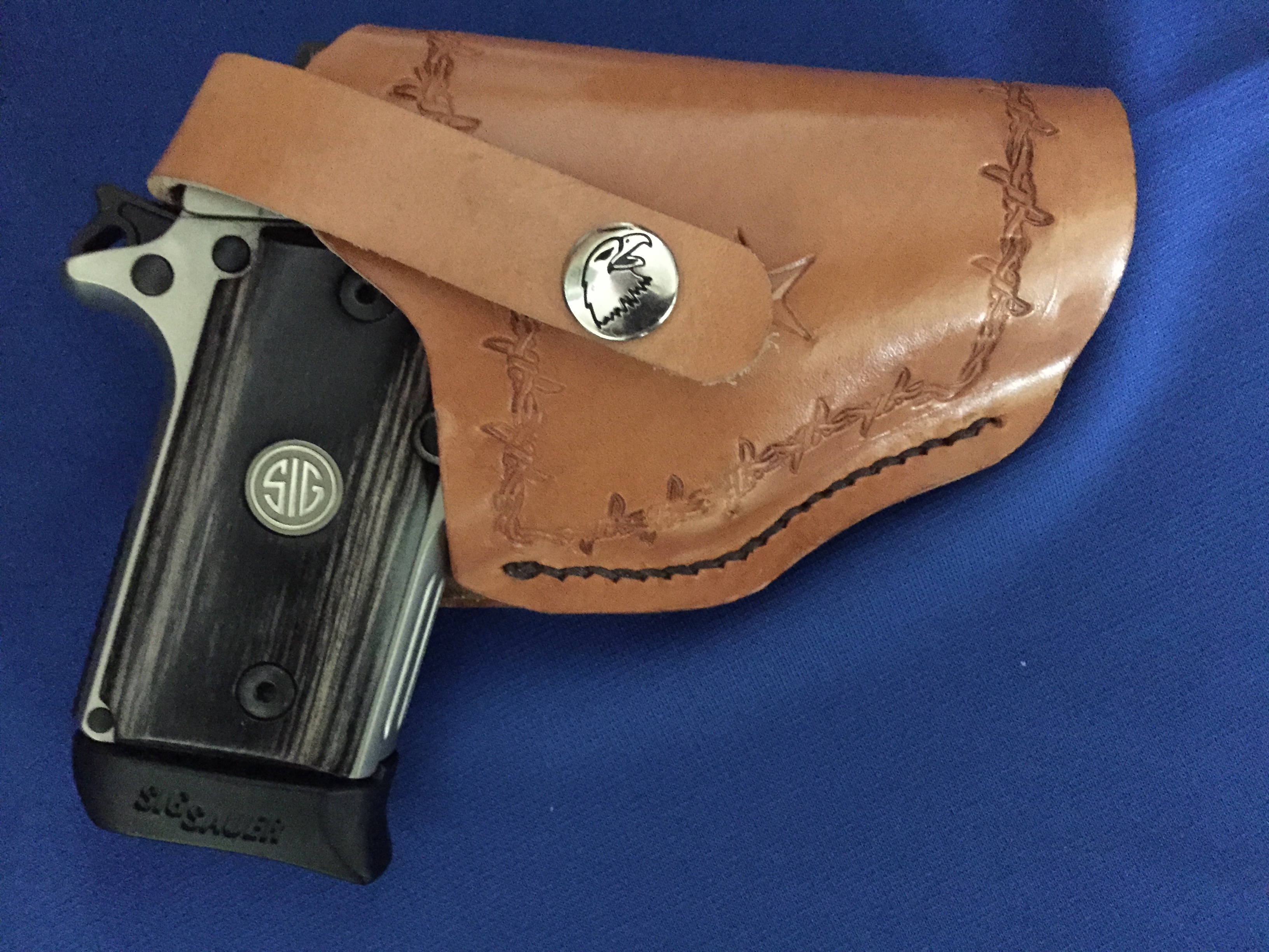 | Another OWB option for the Sig P238. This one has a traditional leather belt loop. From $75, depending on tooling. | |